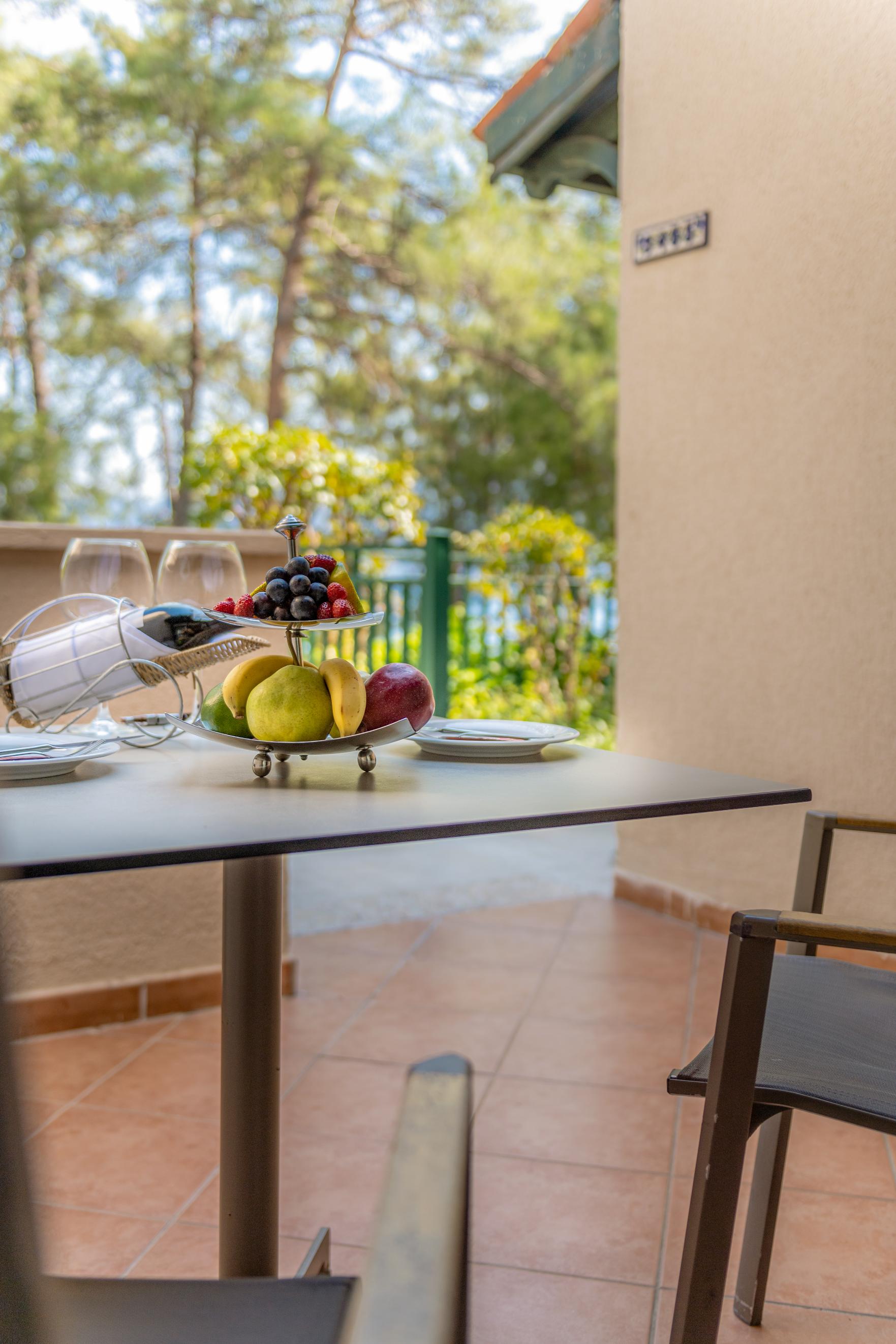 Family rooms are located in the garden area and feature two bedrooms (one with a double bed and the other with twin beds). All rooms include a bathroom with a shower and a spacious balcony or terrace. Most rooms offer sea views, while the remaining ones overlook the garden or forest. These rooms are ideal for large families.